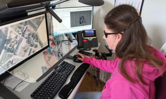 Die Schülerinnen und Schüler wurden dann in zwei Gruppen aufgeteilt. Während die einen sich zeigen ließen, wie Luftbilder und alte Karten gescannt und für die Speicherung aufbereitet werden, testete die andere Gruppe, ob sie mit einer 3D-Brille richtig dreidimensional sehen können und in der Lage wären amtliche Höhenmodelle zu erstellen. Dann wurde getauscht.