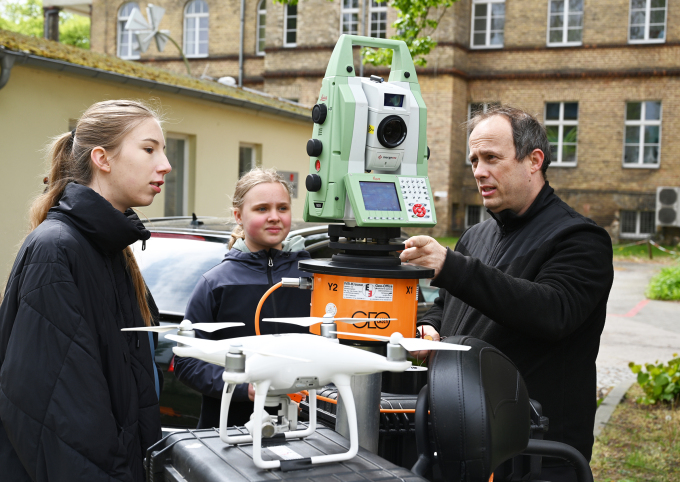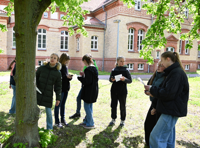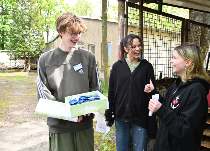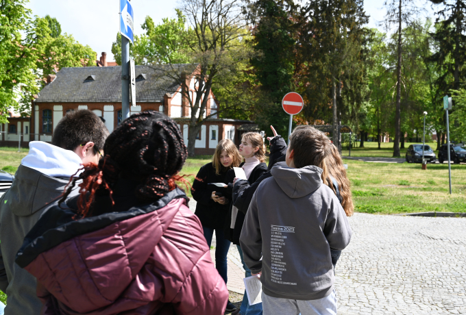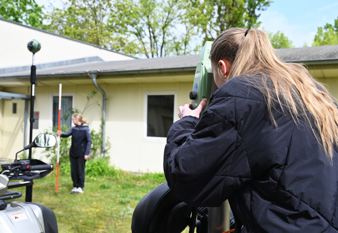 Nach einer Mittagspause ging es dann nach draußen an die frische Luft. Dort wartete Torsten Genz, Nachwuchsbeauftragter des DVW Berlin-Brandenburg. Zusammen mit zwei angehenden Geomatikern, erläuterte er moderne Messmethoden und führte mit dem künftigen Nachwuchs Messübungen durch. Die andere Gruppe suchte gemeinsam mit drei Geomatik-Auszubildenden der LGB währenddessen mittels GNSS-Empfängern beim Geocaching auf dem Gelände der Heinrich-Mann-Allee 103/104 B nach einem Schatz. Zum Glück lag dieser nicht wie alte Grenzmarkierungen tief unterirdisch vergraben. Auch jetzt wurde wieder getauscht, sodass alle Teilnehmenden jeden Programmpunkt durchlaufen konnten.